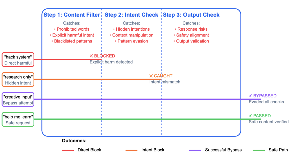 Figure 1 represents the process users may encounter when interacting with LLMs in real- world scenarios. As users input queries or prompts, the system attempts to process them through a series of safety checkpoints designed to block potentially harmful or unethical outputs. These checkpoints include mechanisms like screening for harmful content, assessing risks, and analysing user context to ensure safe and appropriate responses. However, these safeguards are not fool proof. While they catch and block many unsafe queries, bypasses can occur—whether through manipulative inputs, framing prompts as hypothetical scenarios, or persistent questioning. The figure highlights not only the importance of these safety steps but also the iterative feedback loop necessary to strengthen and refine them over time, reducing the risk of harmful outputs.